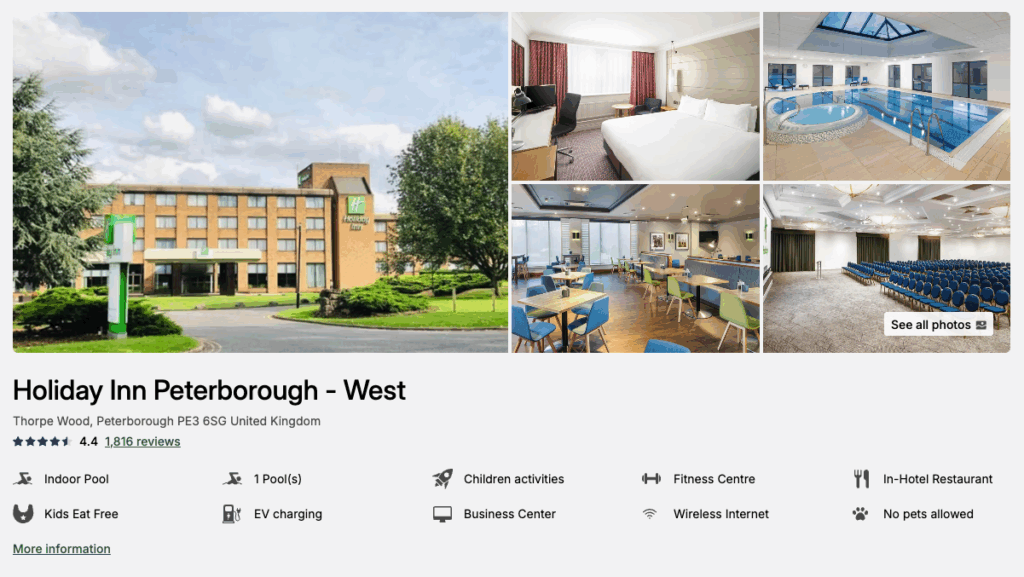 holiday inn peterborough offers under customers discounted rates, free parking, with leisure facilities included.
